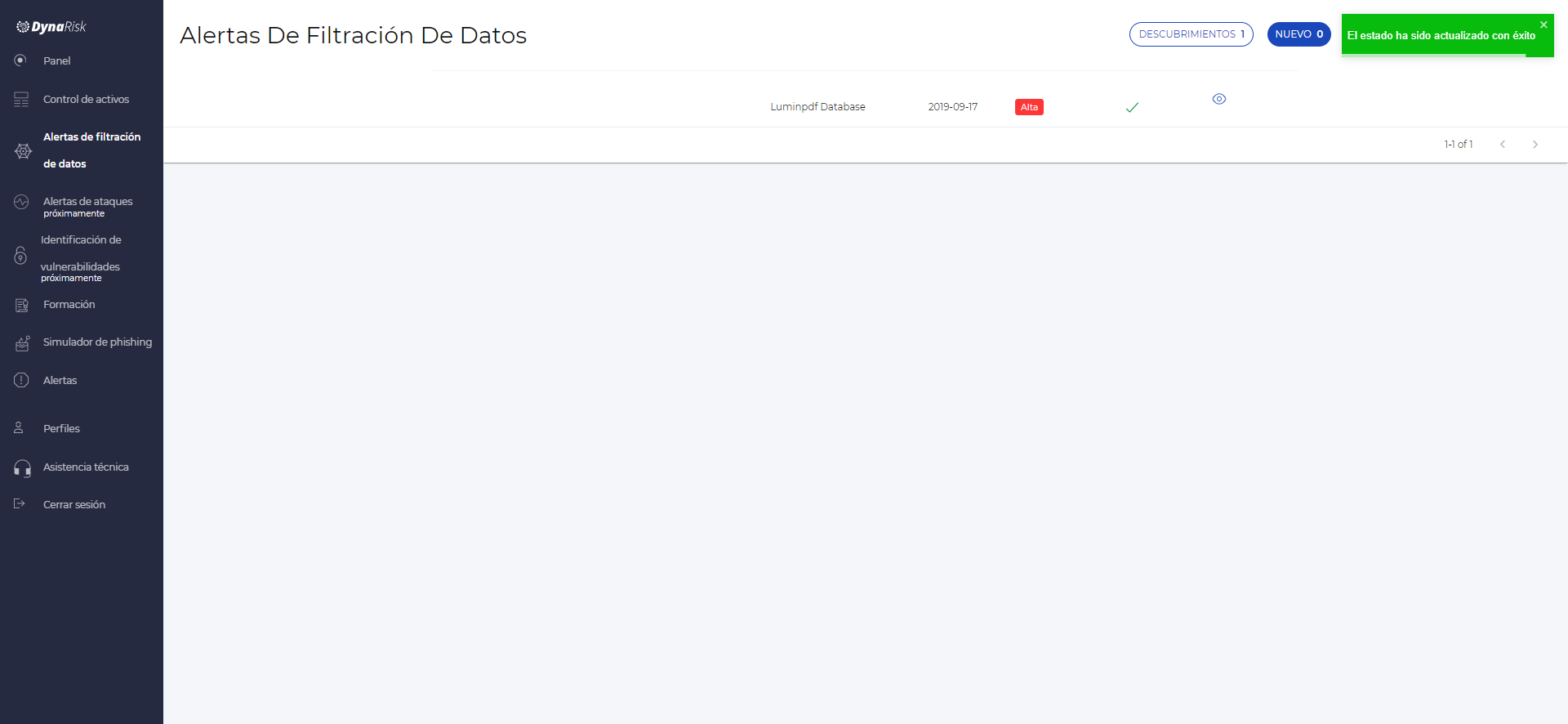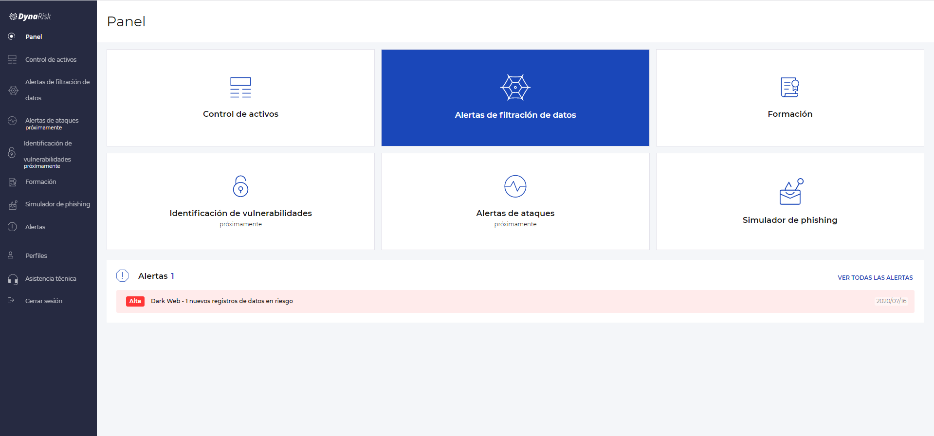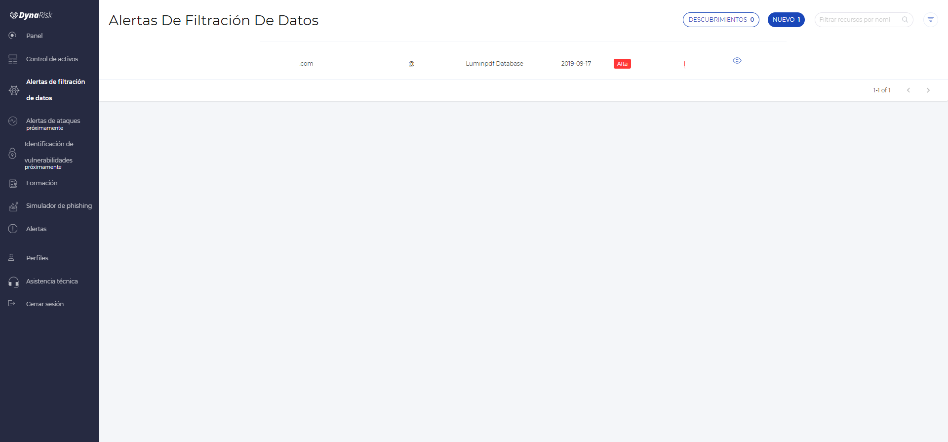 Para acceder a la sección de Alertas de filtración de datos, simplemente haz click en el icono de Alertas de Filtración de Datos que se encuentra en el panel o en el menú del costado izquierdo.